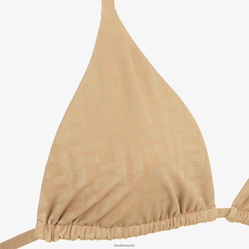 costum de baie cu top si jos triunghiular cu cravate pe solduri. din lycra bej decorat cu un motiv ff jacquard.