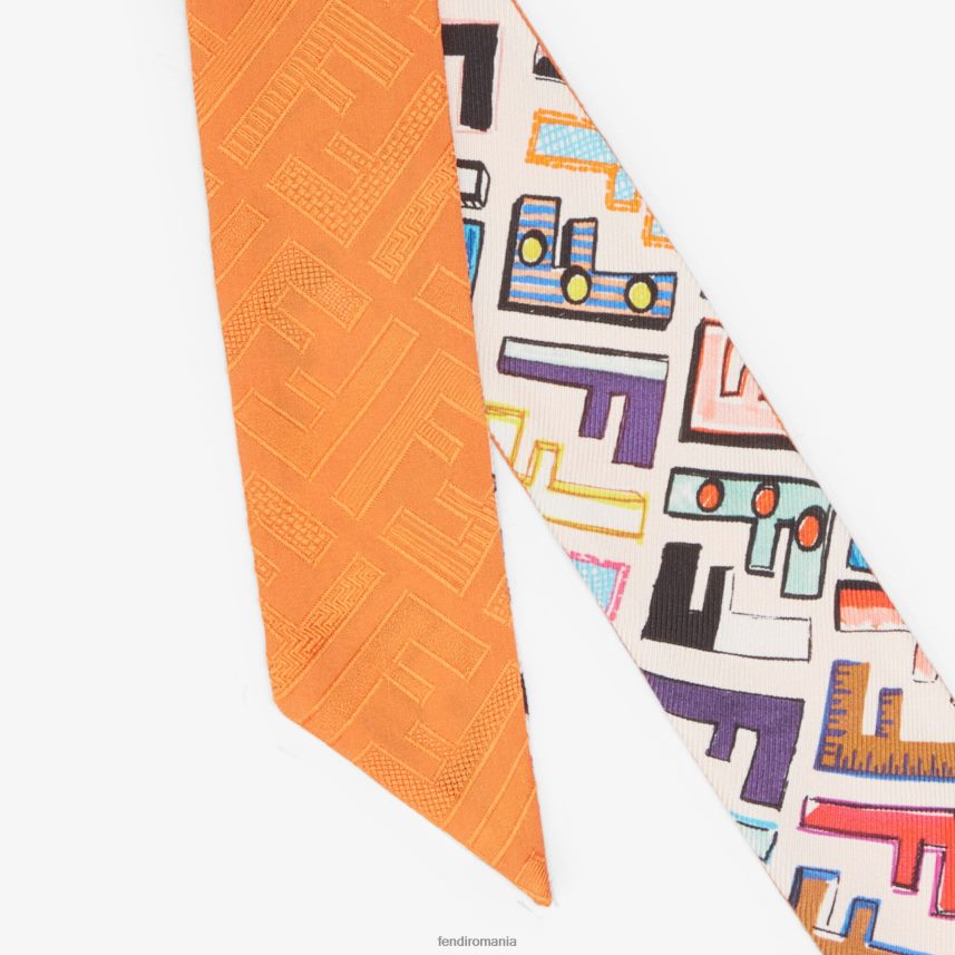 ambalat pe două fețe. de purtat la gat, ca centura sau legata la incheietura mainii sau pentru a adauga o nota de culoare gentilor. din twill de mătase. pe o parte este imprimată emblematica ff, interpretată cu modele multicolore desenate manual pe un fundal alb. partea portocalie este impodobita cu lucrare jacquard ff.