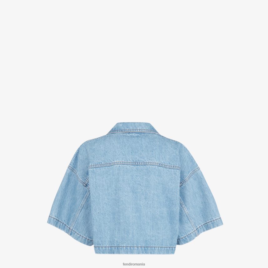 jachetă oversize, tăiată, cu guler bowling și mâneci scurte late. buzunar plast pe piept. închidere cu apăsare acoperită. din denim albastru ușor decolorat. împodobită cu cusături contrastante și cataramă baghetă din metal cu finisaj paladiu pe buzunar. captuseala personalizata cu motivul ff.