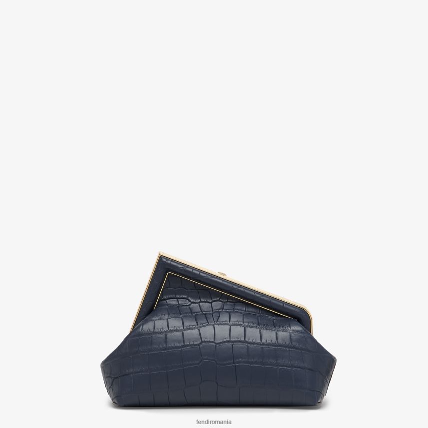 geantă fendi first mică din piele de crocodil albastru închis rafinat, cu închidere f supradimensionată din metal, cu un decor luxos într-un pavaj de cristal.