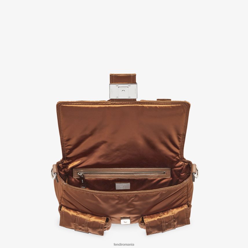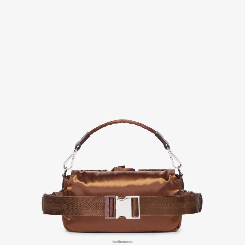 Geanta multibuzunare bagheta din nailon reciclat maro lucios, cu cinci buzunare plasate de diferite marimi. buzunarele și clapa din față sunt decorate cu emblematica închidere ff. împodobite cu piele neagră.
