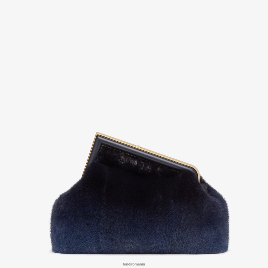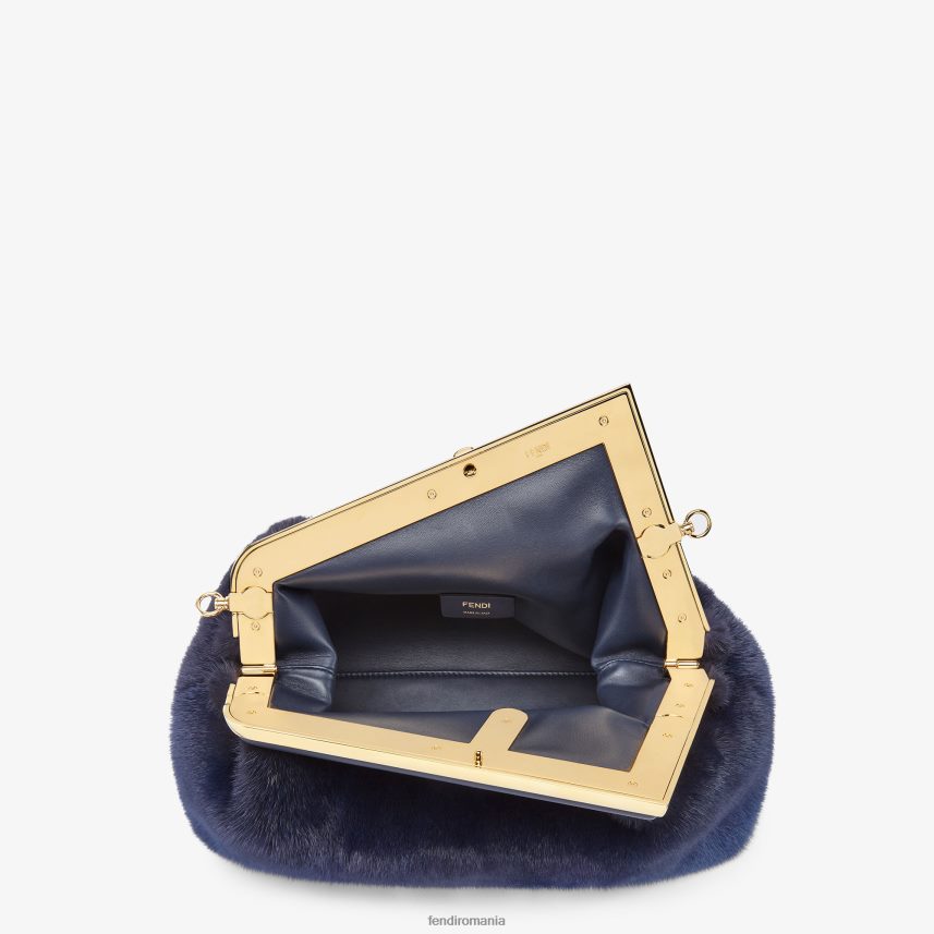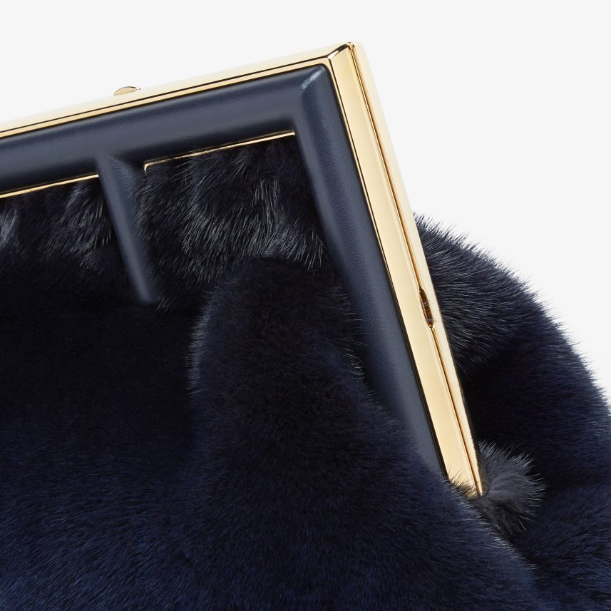 geantă medie fendi first din nurcă moale, cu efect gradat, de culoare albastru închis, cu închidere f metalică supradimensionată legată în piele nappa ton pe ton.