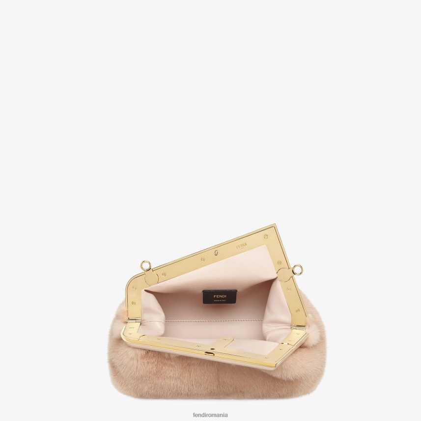 geantă mică fendi first din nurcă moale, roz pal, cu închidere f metalică supradimensionată legată în piele nappa ton pe ton.
